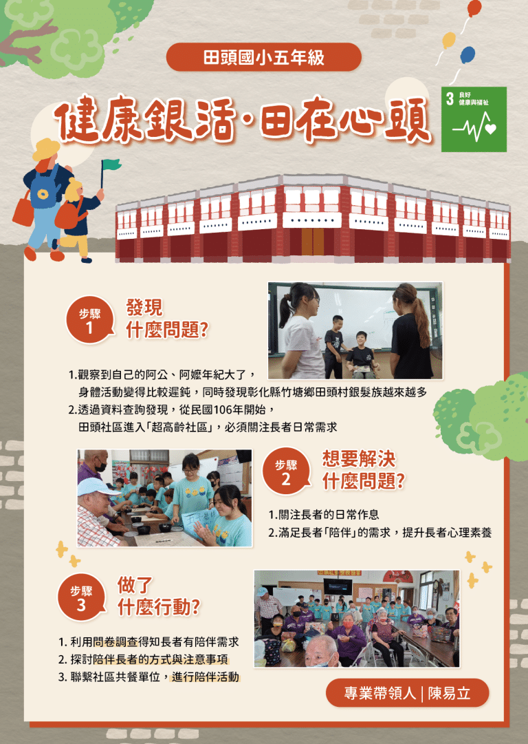 We Are 公民素養課程:實踐永續行動「健康銀活・田在心頭」 服務學習課程期間:113 年 9 月 ~ 114 年 6 月 團隊名稱:田頭國小五年級專業帶領人:陳易立SDG3「健康與福祉」孩子們在家裡長輩的身上發現田頭社區進入「超高齡社區」的隱憂。透過問卷調查得知長者有陪伴需求,進一步設計出與社區共餐單位合作進行長者的陪伴活動。透過這樣的學習,不只是對「健康與福祉」的回應,更是跨世代對話的開始。 發現什麼問題 觀察到自己的阿公、阿嬤年紀大了,身體活動變得比較遲鈍,同時發現彰化縣竹塘鄉田頭村銀髮族越來越多。透過資料查詢發現,從民國106年開始,田頭社區進入「超高齡社區」,必須關注長者日常需求。 想要解決什麼問題 關注長者的日常作息。滿足長者「陪伴」的需求,提升長者心理素養。 做了什麼行動 利用問卷調查得知長者有陪伴需求。探討陪伴長者的方式與注意事項。聯繫社區共餐單位,進行陪伴活動。 訪問社區發展協會理事長,理解社區銀髮族長輩事務。 各組討論發表服務銀髮族長輩相關事項 演練服務過程,熟悉服務銀髮族長輩相關事務。 前往社區活動中心,帶領銀髮族長輩進行遊戲。 前往社區活動中心,與銀髮族長輩一起玩桌遊(五子棋)。 前往社區活動中心,與銀髮族長輩一起玩桌遊(推推棋)。 帶領銀髮族長輩帶動跳,活動筋骨身體好。 與銀髮族長輩共餐,溫馨共餐祖孫情。 與田頭社區銀髮族共餐長輩合照
