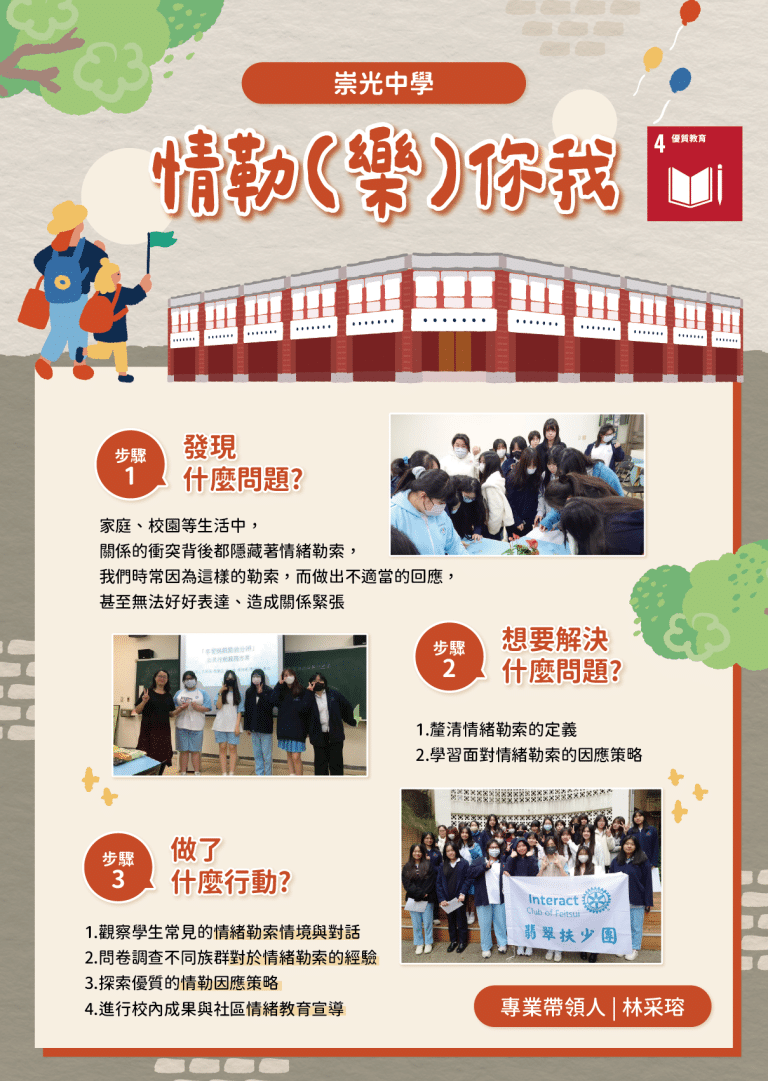 We Are 公民素養課程:實踐永續行動「情勒(樂)你我」 服務學習課程期間:113 年 9 月 ~ 114 年 6 月 團隊名稱:崇光中學專業帶領人:林采瑢SDG4「優質教育」崇光中學的學生選擇面對一個不容易說出口的議題:情緒勒索。他們觀察校園常見的情緒互動、進行調查與設計回應策略,並將所學透過校內與社區宣導將成果分享出去。這堂課,讓學生認識了情緒,也學會了溝通與同理。 發現什麼問題 家庭、校園等生活中,關係的衝突背後都隱藏著情緒勒索,我們時常因為這樣的勒索,而做出不適當的回應,甚至無法好好表達、造成關係緊張。 想要解決什麼問題 釐清情緒勒索的定義。學習面對情緒勒索的因應策略。 做了什麼行動 觀察學生常見的情緒勒索情境與對話。問卷調查不同族群對於情緒勒索的經驗。探索優質的情勒因應策略。進行校內成果與社區情緒教育宣導。 小組報告「公民服務行動方案」 也思服務學習學習協會謝采恩專員向同學解說「公民行動服務方案」 透過情緒勒所對對碰遊戲,帶領社區民眾認識情緒勒索對人際關係的影響。 服務學習基礎培訓 小組從生活經驗,發覺服務的公民議題,並加以討論可行的行動方案。 小組報告服務學習的反思 同學設計情緒勒索牌卡,參與也思服務學習嘉年華。 邀請民眾寫下面關係中的情緒勒索時,可行的互動策略。 同學分享「情勒你我」的公民行動服務成果 頒發公民行動服務方案優良作品
