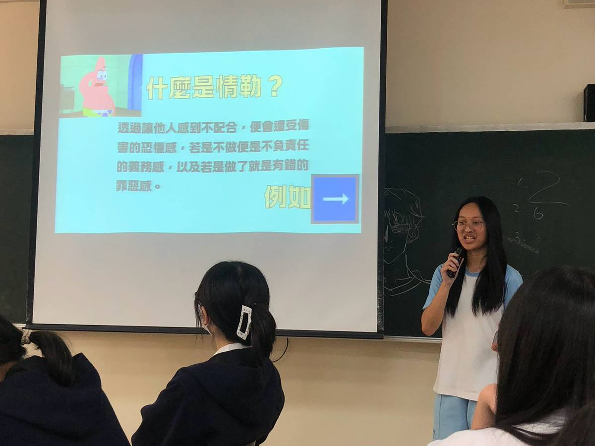 We Are 公民素養課程:實踐永續行動「情勒(樂)你我」 服務學習課程期間:113 年 9 月 ~ 114 年 6 月 團隊名稱:崇光中學專業帶領人:林采瑢SDG4「優質教育」崇光中學的學生選擇面對一個不容易說出口的議題:情緒勒索。他們觀察校園常見的情緒互動、進行調查與設計回應策略,並將所學透過校內與社區宣導將成果分享出去。這堂課,讓學生認識了情緒,也學會了溝通與同理。 發現什麼問題 家庭、校園等生活中,關係的衝突背後都隱藏著情緒勒索,我們時常因為這樣的勒索,而做出不適當的回應,甚至無法好好表達、造成關係緊張。 想要解決什麼問題 釐清情緒勒索的定義。學習面對情緒勒索的因應策略。 做了什麼行動 觀察學生常見的情緒勒索情境與對話。問卷調查不同族群對於情緒勒索的經驗。探索優質的情勒因應策略。進行校內成果與社區情緒教育宣導。 小組報告「公民服務行動方案」 也思服務學習學習協會謝采恩專員向同學解說「公民行動服務方案」 透過情緒勒所對對碰遊戲,帶領社區民眾認識情緒勒索對人際關係的影響。 服務學習基礎培訓 小組從生活經驗,發覺服務的公民議題,並加以討論可行的行動方案。 小組報告服務學習的反思 同學設計情緒勒索牌卡,參與也思服務學習嘉年華。 邀請民眾寫下面關係中的情緒勒索時,可行的互動策略。 同學分享「情勒你我」的公民行動服務成果 頒發公民行動服務方案優良作品