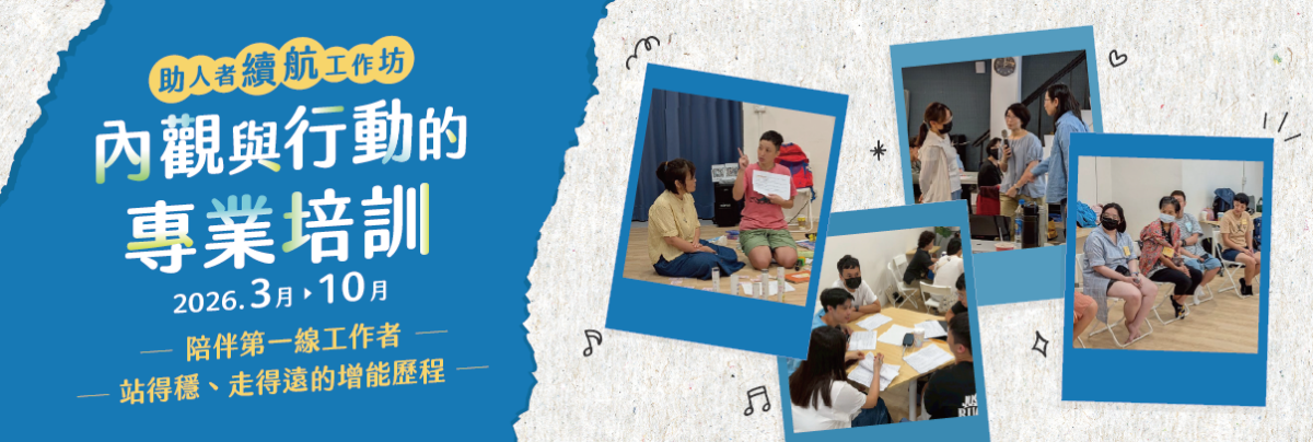 1、助人歷程回顧與初心覺察 2、辨識自己在助人關係中慣常呈現的身形 3、反映對話協助覺察行動模式與角色期待 4、小團體討論以建立信任與共同語言 |